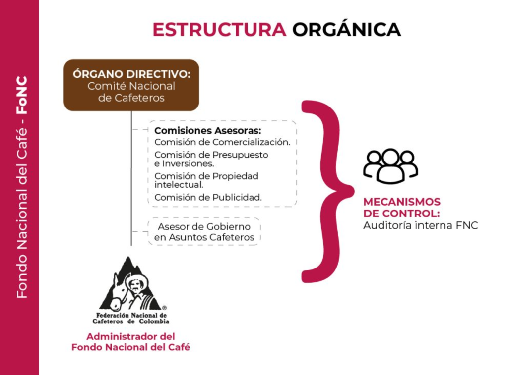 El órgano directivo del FoNC es el Comité Nacional, integrado por representantes del Gobierno Nacional y del Gremio Cafetero. Dentro de sus funciones se destacan: