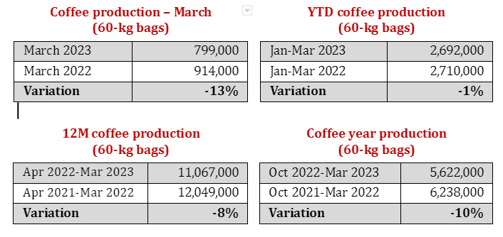 And so far this coffee year (October 2022-March 2023), production topped 5.6 million bags, down 10% from the 6.2 million bags produced in the same previous period.
