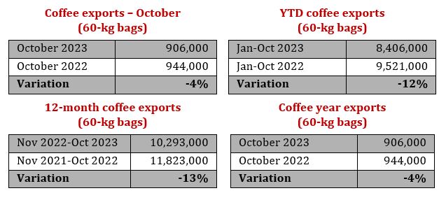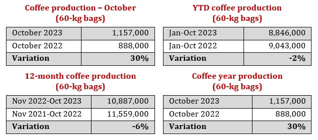 Bogotá, November 8, 2023 (FNC Press Office) – In October, the recorded coffee production of Colombia, the world’s largest producer of washed mild Arabica, was 1.2 million 60-kg bags, up 30% from the 888,000 bags produced in the same month of the previous year.