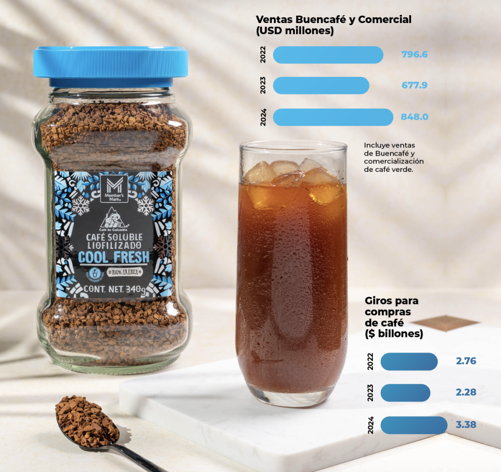 En 2024 el Fondo Nacional del Café (FoNC) registró ingresos por USD 953 millones, de los cuales cerca de USD 630 millones provinieron de la comercialización de café ver - de, USD 220 millones de Buencafé y USD 105 millones de la actividad institucional. Con ventas de café por USD 848 millones (25,1% más que en 2023), la comercialización de café verde y liofilizado se consolidan como mo - tores en la generación de ingresos para el FoNC. Como parte del ciclo de comerciali - zación, el FoNC giró $3,38 billones para compras de café, de los cuales $1,8 billones se giraron en los dos últimos meses del año, equivalentes al 33% de la cosecha del país, preser - vando y garantizando la garantía de compra pese al alza de los precios.