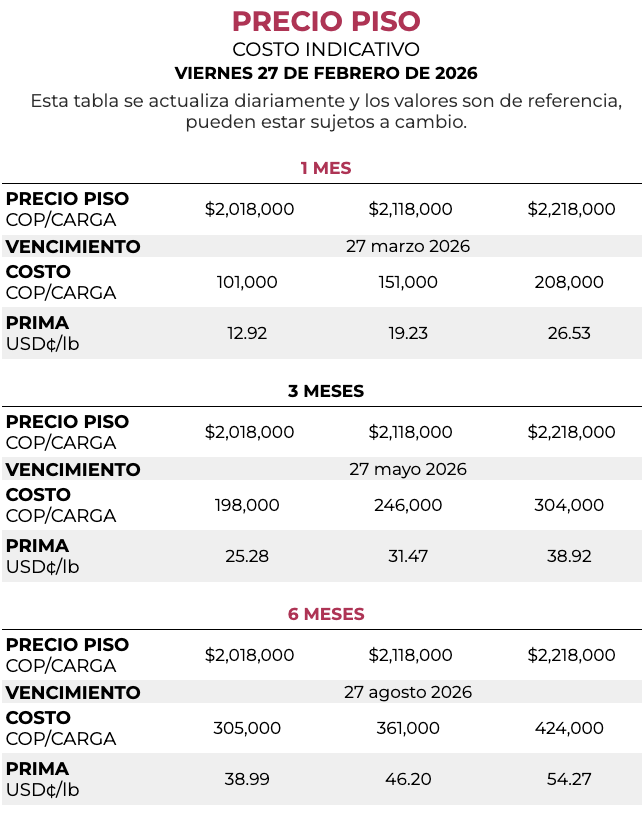Después de leer cómo funciona este mecanismo de precio piso, si es de su interés acceder a él consulte el precio de referencia. Tenga presente que esta tabla se actualiza diariamente, estos valores son de referencia y pueden estar sujetos a cambio.