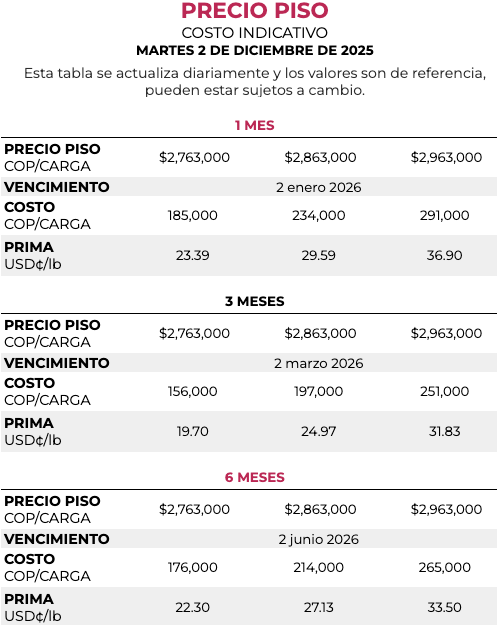 Después de leer cómo funciona este mecanismo de precio piso, si es de su interés acceder a él consulte el precio de referencia. Tenga presente que esta tabla se actualiza diariamente, estos valores son de referencia y pueden estar sujetos a cambio.